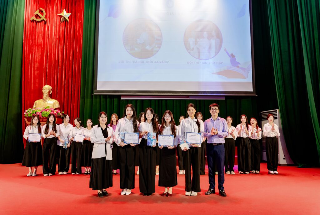 V. Giải Book Talk được yêu thích nhất: Đội thi “Tam thư hội” (giới thiệu cuốn “Những đứa con của cây cầu Long Biên”; thực hiện: nhóm các bạn Khoa Tiếng Trung Quốc gồm: Đỗ Thị Thu Trà – K49C, Hà Thị Yến Nhi – K49A, Lưu Thị Thu Huyền – K49B).